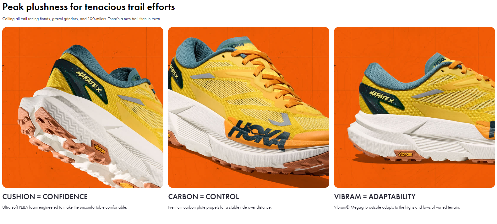 Ruft alle Trail-Rennbegeisterten, Gravel-Grinder und 100-Meilen-Läufer! Es gibt einen neuen Trail-Titan in der Stadt. Entwickelt für Langstrecken-Einsätze, bietet der Mafate X supreme Weichheit mit einem dualen Dichte, hochwertigen Schaum-Chassis, einer PEBA-Oberfläche und einem Schub an Antrieb dank unserer geforkten Kohlefaserplatte. Wir haben ein ultraleichtes gewebtes Obermaterial implementiert, das eine einfache Entwässerung ermöglicht, sowie eine Vibram® Megagrip-Außensohle mit podartigen Ausschnitten, um eine sanfte Fahrt über variierendes Terrain zu gewährleisten.